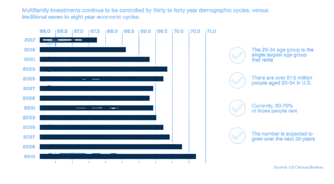 Multifamily investments continue to be controlled by thirty to forty year demographic cycles, versus