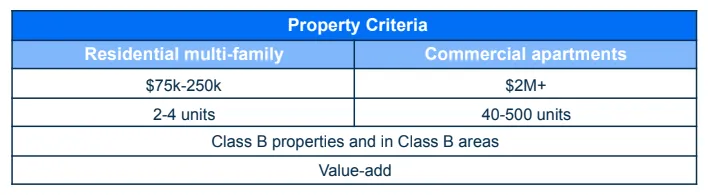 “Distressed” “B” Class apartment buildings requiring cosmetic upgrades, modernized unit turns, updated amenities, software integration for tenants and high touch management